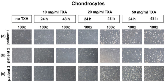 Similar to our results, Marmotti et al. reported no clearly significant effects on cytotoxicity as well as no significant effects on the expression of chondrogenic markers and cell morphology after topical treatment of chondrocytes with TXA [10]. Further, McLean et al. noted a decrease in cell viability in chondrocytes, fibroblast-like cells and tenocytes after topical treatment with TXA at concentrations as low as 1 mg/mL for 24 h [3].