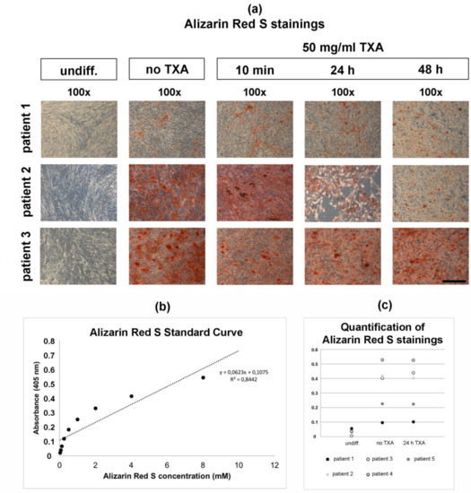 Undifferentiated control samples showed no positive Alizarin Red S stainings (Figure 4a, undiff.), while all osteogenically differentiated samples showed positive Alizarin Red S stainings after 21 d independent of the exposure time to TXA (Figure 4a, no TXA, 50 mg/mL TXA). The intensity of Alizarin Red S stainings seemed higher in samples derived from patient 2 (Figure 4a, patient 2) and patient 3 (Figure 4a, patient 3).