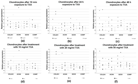 RT-PCR was performed to evaluate changes in the expression of chondrogenic marker genes in chondrocytes after treatment with varying exposure times (10 min, 24 h and 48 h) and concentrations (no TXA, 10 mg/mL, 20 mg/mL and 50 mg/mL) of TXA (Figure 5). The results were shown in dependence of the concentrations (Figure 5a–c) of TXA and exposure times (Figure 5d–f) to TXA.