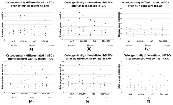 RT-PCR was performed to evaluate changes in the expression of osteogenic marker genes in hMSCs after osteogenic differentiation for 21 d as well as treatment with varying exposure times (10 min, 24 h and 48 h) and concentrations (no TXA, 10 mg/mL, 20 mg/mL and 50 mg/mL) of TXA (Figure 6). The results were pictured in dependence of the used concentrations (Figure 6a–c) of TXA and exposure times (Figure 6d–f) to TXA.