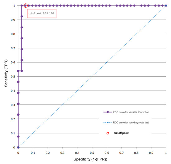 A cut-off point for the true positive rate group of patients with a prediction value (P) equal to or greater than 0.322 was marked. The cut-off value was based on a set false positive rate of 5.0%—the maximum prediction error of CC tolerance (Table 4).