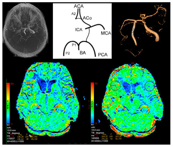 - Bagan, P.; Azorin, J.; Salama, J.; Dumas, J.-L. The value of phase-contrast magnetic resonance angiography of the circle of Willis in predicting cerebral ischemia-hypoxia (shunt need) during carotid endarterectomy. Surg. Radiol. Anat. 2005, 27, 544–547. [Google Scholar] [CrossRef]