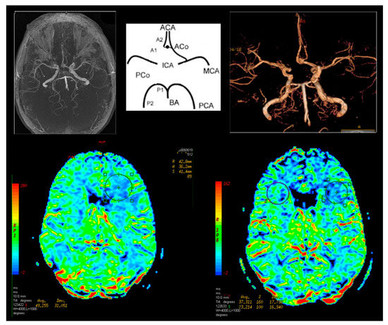 Magnetic resonance brain perfusion with Acetazolamide and magnetic resonance angiography of the intracranial arteries. Right internal carotid artery—100%, left internal carotid artery—70%. Differences after admission of Acetazolamide marked with circles (right side).