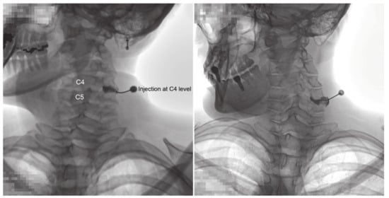 - Kim, K.H.; Choi, S.H.; Kim, T.K.; Shin, S.W.; Kim, C.H.; Kim, J.I. Cervical facet joint injections in the neck and shoulder pain. J. Korean Med. Sci. 2005, 20, 659–662. [Google Scholar] [CrossRef]