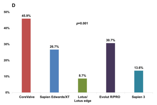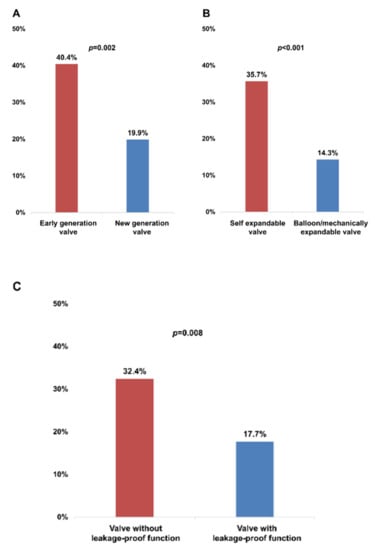 Figure 2 shows the incidence of PVL depending on valve type. The incidence of significant PVL was higher in patients using the early generation valve than in those using the new-generation valve (40.4% vs. 19.9%, p = 0.002, Figure 2A), in patients using the self-expandable valve than in those using the balloon-expandable valve (35.7% vs. 14.3%, p ˂ 0.001, Figure 2B), and in patients using a valve without leakage-proof function than in those using a valve with leakage-proof function (32.4% vs. 17.7%, p = 0.008, Figure 2C). Among the three different brands of TAVI valve, the Lotus brand had a tendency with a lesser risk for PVL, whereas the Evolut brand was associated with a higher risk for PVL (Figure 2D). However, the incidence of permanent pacemaker (PPM) insertion within 1 month was comparable between the two different valve types using less OI in valves with leakage-proof function (valves with leakage-proof function vs. valves without leakage-proof function, OI, 12.1 ± 6.2% vs. 15.9 ± 7.9%, p < 0.001, the incidence of PPM insertion, 5.4% vs. 5.6%, p = 0.954).