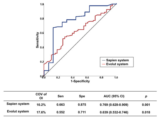 Table 3 summarizes the results of the multivariable model for the predictors of PVL. The possible predictors for PVL included in the multivariable model were factors from patients (total calcium amount, calcium difference between leaflets, commissure calcification, LVOT calcification, and eccentricity index of the annulus), device (valve with leakage-proof function or self-expandable valve), and procedure (OI). In the logistic regression model for the entire population, any patient factor was not a predictor of PVL. Meanwhile, the device or procedure factors were significant. The valve without leakage-proof function was associated with significant PVL (adjusted OR, 3.194, 95% CI, 1.620–6.299, p = 0.001). Lower OI was associated with significant PVL. The incidence of significant PVL increased by 45% when OI decreased by 5% (adjusted OR, 1.451, 95% CI, 1.154–1.825, p = 0.001). In valves without leakage-proof function, a total calcium amount of >800 mm3 (adjusted OR, 4.217, 95% CI, 1.519–11.708, p = 0.006) and a lower OI (OI per a decrease by 5%, adjusted OR, 1.645, 95% CI, 1.188–2.278, p = 0.003) were associated with significant PVL. However, in patients who received a valve with a leakage-proof function, the independent factors of significant PVL were self-expandable valve (Evolut PRO) and lower OI.