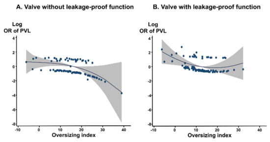 Continuous relation between oversizing index and risk of PVL calculated by fractional polynomial regression. Gray shading indicates 95% confidence interval around the flat line. The OR was adjusted for the calcium amount. (A) valve with leakage-proof function; (B) valve with leakage-proof function. OR, odds ratio; PVL, paravalvular leakage.