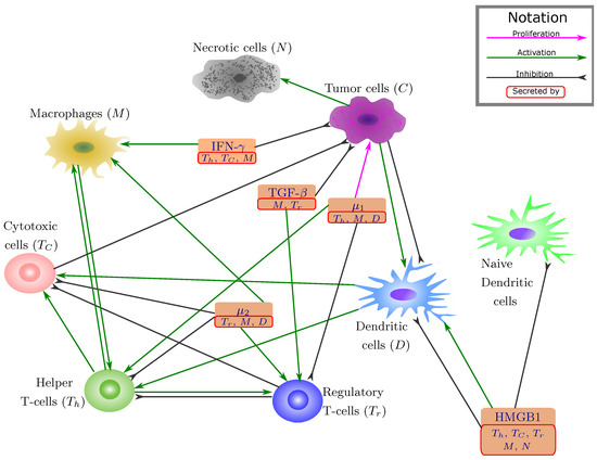 Dendritic cells become activated by HMGB1 [12]. Moreover, TSLP, which is released by cancer cells [19,20], leads to the activation of dendritic cells (green arrow in Figure 1 from cancer cells to DCs). We take TSLP in quasi-equilibrium state as