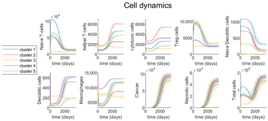 Cluster 4, having the largest density of activated macrophages and a significantly small density of naive macrophages (Figure 2B), first demonstrates average cancer growth rate, but then increases and has one of the two highest cancer cell densities at the steady-state (Figure 5). Similar to cluster 2, cluster 4 has high density of cytotoxic cells (CD8 T-cells and NK cells) initially and at steady-state. Both clusters 2 and 4 have a low growth rate of macrophages and a high density of dendritic cells, compared to other clusters. Immune cell dynamics of clusters 2 and 4 demonstrate that a high density of cytotoxic cells and dendritic cells, along with a low growth rate of macrophages, correlates with a high growth rate of cancer cells.