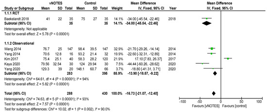 - Is the operation time (OT) of hysterectomy by vNOTES shorter compared to laparoscopy? The pooled data showed a mean difference in operation time (OT) of 16.73 min, in favour of vNOTES (MD −16.73 (95% CI −21.04 to −12.40), Z = 7.57 (p < 0.05)) (Figure 2). We performed a sensitivity analysis on the outlier, the study by Kim et al. [18], which is responsible for the high heterogeneity in this subgroup. They reported a significantly shorter OT for the control group. We believe this to be attributed to the technique of LAVH described in the paper, where the dissection of the ovarian ligaments, round ligaments and broad ligaments was performed by a 45 mm EndoGia® (Covidien, Ireland).