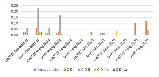 - Is the complication rate of vNOTES hysterectomy different compared to laparoscopy? The types of complications reported were comparable across studies and comparison arms. Intraoperative complications were of bladder or bowel injury or bleeding in both vNOTES and laparoscopic hysterectomy. The differences were not significant (OR 1.10 (95% CI 0.31 to 3.87)) (Figure 3). Postoperative infection (reported as fever or PID) was less frequent in vNOTES than in controls (OR 0.41 (95% CI 0.17 to 0.99), Z = 1.98 (p = 0.05) (Figure S1). Figure 4 shows the fraction of intra- and postoperative infections according to the Clavien–Dindo classification [9,10]. Clavien–Dindo grade I contains cases of fever (without mentioning treatment with antibiotics), pain and hematoma. Grade II contains cases of wound infections, PID and blood transfusion. Grade IIIb contains one case of vesicovaginal fistula repair and cases of reintervention for bleeding. The case in Grade IVa is a case of pulmonary embolism with ICU admission (summary in Table 3). The pooled data for postoperative complication show an OR of 0.38 (95% CI 0.23 to 0.62) in favour of vNOTES. This result was not significant (Figure S2). We additionally pooled data on estimated blood loss (EBL) and decrease in Hb on postoperative day 1 (Figures S3 and S4). EBL was significantly lower in vNOTES (MD −98.87 mL (95% CI −126.67 to −71.07), Z = 6.97 (p < 0.05).