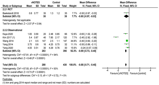 - What is the difference in hospital stay in women treated by vNOTES compared to laparoscopy? Although there was substantial variation in mean hospital stay between studies, hospital stay was shorter for vNOTES in each study. The pooled data showed a mean difference (MD) of 0.58 days (95% CI −0.71 to −0.45) in favour of vNOTES. Z = 8.73 (p < 0.05). We performed a sensitivity analysis for the outlier, the study by Kim et al. [18], which is responsible for the high heterogeneity in this subgroup. They report a range of 4–17 days in length of stay for their control group, leading to a higher MD, which was calculated from the reported median (Figure 5).