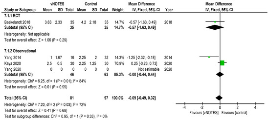 - What is the difference in postoperative pain between women treated by vNOTES hysterectomy and conventional laparoscopic hysterectomy? The randomised trial by Baekelandt et al. [13] reports lower pain scores (VAS 0–10) at 24 h postoperative (not significant), which is comparable to the pooled results extracted for three studies (MD −0.09 (95% CI −0.49 to 0.32)). The data from Chin-Yi Yang et al. [20] could not be used for the pooled analysis for this outcome as we were unable to retrieve information on the timepoint of this score after surgery. (Figure 6).