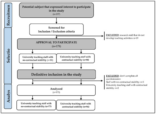 A transversal study was carried out, and the participants were selected following the inclusion criteria: (1) teaching university staff from 5 different Spanish universities; and as exclusion criteria, the following were considered: (1) research staff in training that do not develop teaching activities, (2) leaving any questions unanswered on the questionnaires included in the study. The process of recruitment, selection, and final number of analyzed participants is summarized in Figure 1.