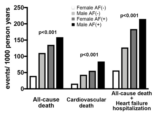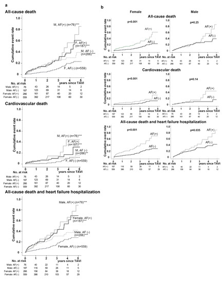 During the 5 -year follow-up period since the TAVI procedure, the incidences of identified all-cause mortality, CV mortality, and the composite of all-cause death and HF hospitalization were 141 (13.0%), 59 (5.4%), and 183 (16.8%) out of 1088 participants, respectively. The incidences of most in-hospital adverse outcomes other than acute kidney injury were similar among the groups (Supplementary Table S1). Meanwhile, the crude long-term event rates for primary and secondary endpoints represented by the number of events per 1000 person years were significantly different among the groups. The number of all endpoints were highest in the Male AF (+) group and constantly the lowest in the Female AF (−) group, while the Male AF (−) and Female AF (+) groups were in between (Figure 1). Similarly, unadjusted Kaplan-Meier analysis followed by the log-rank comparison test showed that the cumulative incidence of all endpoints was constantly lower in the Female AF (−) group compared to the other three groups (Figure 2a and Supplementary Figure S1a). It is interesting to point out that the significantly higher cumulative all-cause and CV mortality rates in patients with AF compared to those without it were present only in female patients, while the incidence of the composite of all-cause death and HF hospitalization was significantly higher in AF patients in both genders (Figure 2b).