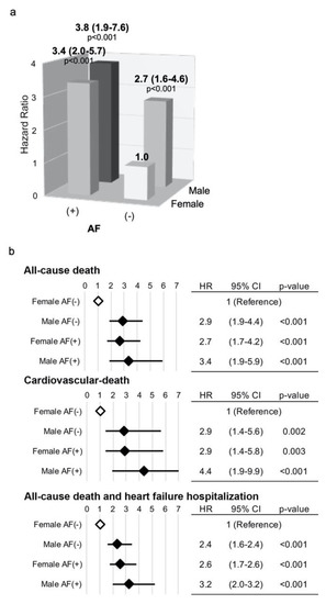 Hazard ratios for all-cause mortality in the 4 patient groups using Model 1 (a) and those for all-cause and cardiovascular mortalities and the composite of all-cause mortality and heart failure hospitalization using Model 2 (b). Hazard ratios, 95% confidence intervals (CI) and p-values for all-cause mortality following TAVI in the Female AF (−), Male AF (−), Female AF (+) and Male AF (+) groups calculated by Cox proportional hazard analysis using Model 1 (a) and Model 2 (b). Open and filled rhombus indicate reference, and significantly increased risk for each endpoint, respectively.