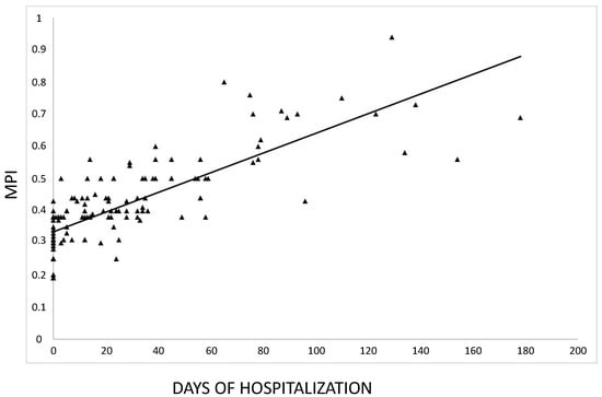We found a significant positive correlation between MPI and total number of days of hospitalization registered over the 24-month follow-up (r = 0.801, p < 0.00001) (Figure 1) as well as between MPI and the number of hospitalizations per year (r = 0.808, p < 0.00001).