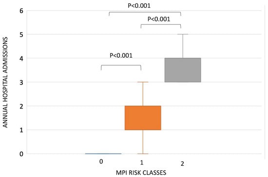 Differences in annual hospital admission between multidimensional prognostic index (MPI) risk class 0 (0, IQR 0; 0), MPI risk class 1 (1, IQR 1; 2) and MPI risk class 2 (4 IQR 3; 4).