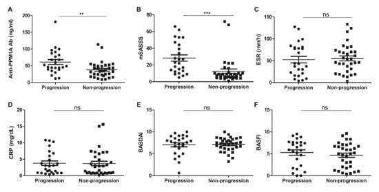 The median follow-up mSASSS was 11.5 (7–28.5) units, and the median time to follow-up mSASSS was 22 (20–25) months. A total of 58 patients maintained anti-TNF agent treatment, among whom, 43.1% (25/58) showed spinal radiographic progression (Table 1). The patients with radiographic progression showed higher baseline anti-PPM1A antibody levels and baseline mSASSS than patients without radiographic progression (Table 1 and Figure 1A,B). However, the serum level of anti-PPM1A antibodies was not correlated with baseline mSASSS (r = −0.001, p = 0.993). Other baseline parameters, including ESR, CRP, BASDAI, and BASFI, were not different between the radiographic progression group and the non-progression group (Figure 1C–F). In the subgroup analysis among the patients having grade 2 sacroiliitis, baseline mSASSS was higher in the progression group than the non-progression group (p = 0.03), but other baseline parameters were not different.