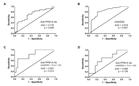 The ROC analysis result is shown in Figure 2. The serum level of anti-PPM1A antibodies had an area under the curve (AUC) of 0.716 (95% CI, 0.580–0.852) at a cut-off value of 43.77 ng/mL (sensitivity 68%, specificity 70%). It showed higher accuracy for predicting radiographic progression when analyzed in males (Supplementary Figure S1). The baseline mSASSS had an AUC of 0.819 (95% CI, 0.708–0.931) at a cut-off value of 13 units (sensitivity 76%, specificity 78%). When subgroup analysis was performed according to the cut-off of the mSASSS, the predictive accuracy of anti-PPM1A antibodies was increased in patients with an mSASSS less than 13 (AUC, 0.827; 95% CI, 0.653–1.000) (Figure 2C).