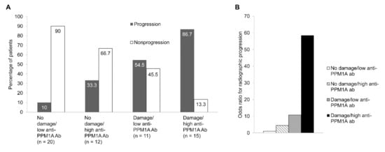(A) Frequency of radiographic progression, (B) odds ratio for radiographic progression categorized according to anti-PPM1A antibodies and mSASSS at baseline. Damage and high anti-PPM1A antibodies were defined as mSASSS ≥13 units and anti-PPM1A antibodies ≥43.77 ng/mL, respectively. PPM1A: Protein phosphatase magnesium-dependent 1A, mSASSS: Modified Stoke Ankylosing Spondylitis Spinal Score.