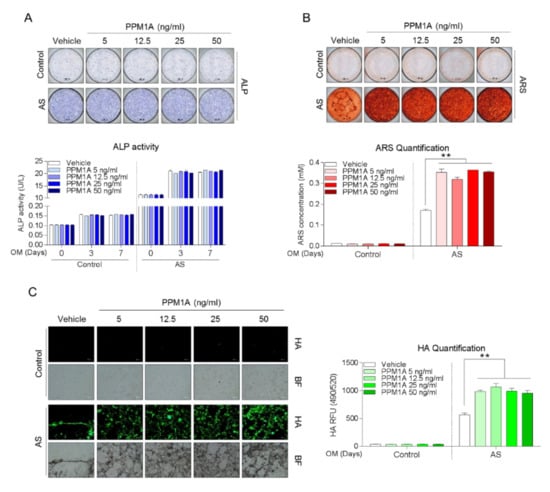Both control- (n = 4) and AS-osteoprogenitors (n = 3) were stimulated with as indicated PPM1A dose during osteogenic differentiation, and subjected to analysis for (A) ALP staining and activity at 0, 3, and 7 days, (B) ARS staining and quantification at 21 days, and (C) Hydroxyapatite staining and quantification at 21 days. Data are presented as means + SD; ** p < 0.01 by unpaired two-tailed t-tests. AS: Ankylosing spondylitis, PPM1A: Protein phosphatase magnesium-dependent 1A, ALP: Alkaline phosphatase, ARS: Alizarin Red S, HA: Hydroxyapatite.