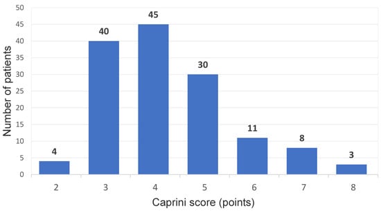 The mean duration of the surgical procedure was 48 min (from 25–80 min), and in the group, no surgical complications were noticed. Among the 141 patients who were operated on, the presence of a postoperative DVT was diagnosed in 5 cases (3.5%); all of these patients received a full 10-day course of pharmacological thromboprophylaxis with enoxaparin 40 mg od. In all of these cases, distal DVT in the same operated leg was confirmed with crural deep vein involvement. In one case, the presence of DVT was accompanied with clinical symptoms (symptomatic DVT in the study population: 0.7%). In the group with DVT cases, three out of five were diagnosed on day 10 postoperative control, while a further two were confirmed in the venous US examination performed 30 days after the procedure. No clinically documented PE episodes were noticed, and no bleeding complications nor any other adverse events potentially related to the pharmacological prophylaxis were observed. According to the Caprini model assessment, 4 patients (2.8%) were qualified as low VTE risk (young patients, short procedure, no additional risk factors), 85 presented moderate risk (60.2%), and in 52 cases (36.8%), high VTE risk was confirmed (the Caprini score distribution in the study population is presented in Figure 1).
