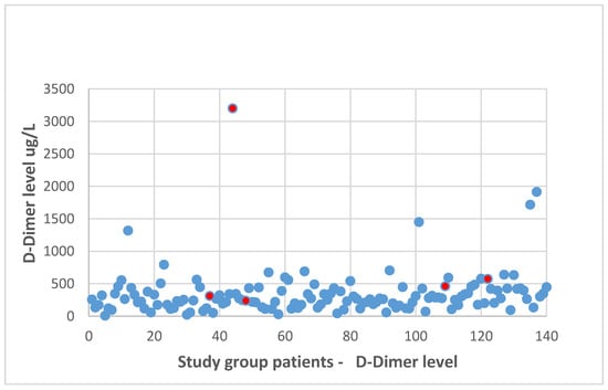 Regarding the preoperative D-dimer level evaluation, a negative test result was confirmed in 119 patients, whereas in 22 cases, elevated D-dimer values were found. In the group of DVT patients, in 40% (two out of five patients), elevated preoperative D-dimer levels were reported. However, DVT was diagnosed in only 9.5% of all patients with initially elevated D-dimer levels. There was no statistically significant differences concerning preoperative D-dimer levels between the patients with and without DVT diagnosed in the postoperative course (median of the D-dimer level in the patients with DVT: 462 (239–3200) µg/L vs. median of the D-dimer level in the patients without DVT: 265 (8–1914) µg/L; p > 0.05). The distribution of the D-dimer level values is presented in Figure 2.