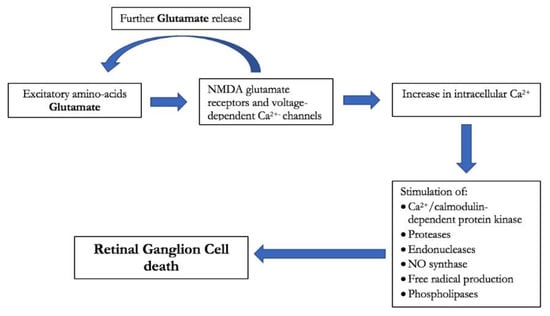 Diagram of glutamate-induced toxicity on retinal ganglion cell.