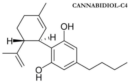 Phytocannabinoids are derived from flowers and leaves of Cannabis sativa, Cannabis indica, and Cannabis ruderalis. About 113 different cannabinoids can be isolated from Cannabis sativa (Figure 1); the most represented and studied ones are tetrahydrocannabinol (THC), cannabidiol (CBD), and cannabinol (CBN), which present important psychoactive effects [20]. CBD is most abundant in Cannabis sativa, THC derives mainly from Cannabis indica, while Cannabis ruderalis presents low amounts of psychoactive cannabinoids [21,22]. All the aforementioned molecules are synthetized in glandular trichomes of Cannabis plants from fatty acid and isoprenoid precursors [23,24]. All cannabinoids consist of a lipid backbone with the incorporation of alkylresorcinol and monoterpene groups with highly lipophilic properties [21,22]. Cannabinoids can be administered orally, topically, or through inhalation. Bioavailability for phytocannabinoids in humans is higher when administered through inhalation: 10–35% for THC, 11–45% for CBD, and 38% for CBN [7,25,26,27]. An extensive first-pass liver metabolism otherwise reduces the oral bioavailability to 5–20% for THC and 13–19% for CBD [28]. No clinical data are available on bioavailability after topical administration in humans; in rabbits, topical THC showed a variable systemic bioavailability between 6 to 40% [29]. Cannabinoids exploit their effects through interaction with cannabinoid receptor 1 (CB1) and cannabinoid receptor 2 (CB2) [30,31]. These G-protein-coupled receptors share 48% of their amino acid sequence identity and their activation causes inhibition of adenylate cyclase with consequent reduced conversion of ATP to cAMP. CB1 receptors are mainly found in the central nervous system (CNS), while CB2 receptors are mainly expressed in peripheral tissues and the immune system. Both receptors find in endocannabinoids their natural ligand.