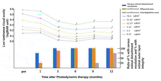 Mean change from baseline of low luminance visual acuity (LLVA), percentage of serous retinal detachment resolution, and integrity of retinal outer layer determined on images of horizontal optical coherence tomographic scans before and after half-dose photodynamic therapy. LLVA is significantly better at 3, 6, and 12 months after surgery than at baseline, at all luminance levels. * p < 0.05. The time courses of recovery of the ellipsoid zone and improvement of LLVA are almost the same.