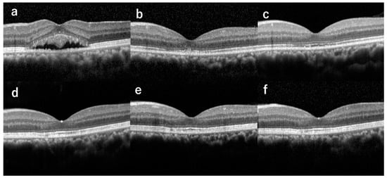 Optical coherence tomography images of the left eye of a 41-year-old male (Case 1) with chronic central serous chorioretinopathy showing serial changes of the ellipsoid zone (EZ) and interdigitation zone (IZ), from before half-dose photodynamic therapy (hdPDT) to complete recovery of the two zones after hdPDT. In this case, the serous retinal detachment was completely absorbed at 1 month after hdPDT. (a) Before hdPDT, EZ and IZ at the fovea were both absent. (b) At 1 month after hdPDT, EZ and IZ were both absent. (c) At 3 months, EZ was continuous and IZ was absent. (d) At 6 months, EZ was continuous and IZ was fragmented. (e) At 9 months, EZ was continuous and IZ was fragmented. (f) At 12 months, EZ and IZ were both continuous.