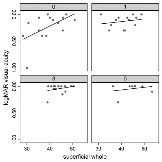 Correlation of the whole superficial capillary plexus vessel density (superficial whole) with visual acuity during follow-up.