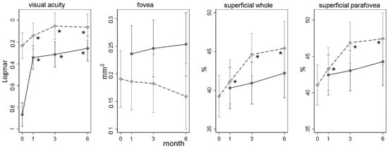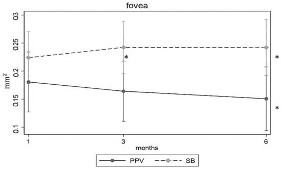 A reduction in the FAZ area at 6 months in the PPV group was found; moreover, an augmentation in the FAZ area at 3 and 6 months in the SB group was found (Figure 3).