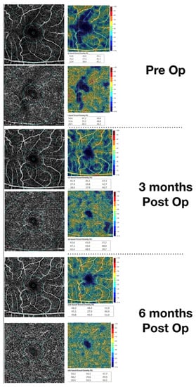 The preoperative VD of the whole SCP (wSCP) on affected eyes was proven to be significantly lower in comparison with the fellow eyes (p < 0.05); nevertheless, this difference between the two groups disappeared at 6 months after surgery (p = 0.88), with a restoration of the normal wSCP vascular density in the affected eyes. The VD of the wSCP in affected eye significantly increased during follow-up (p < 0.001); moreover, it was correlated to preoperative BCVA (p < 0.05)—the higher the preoperative wSCP vascular density, the better the baseline visual acuity.