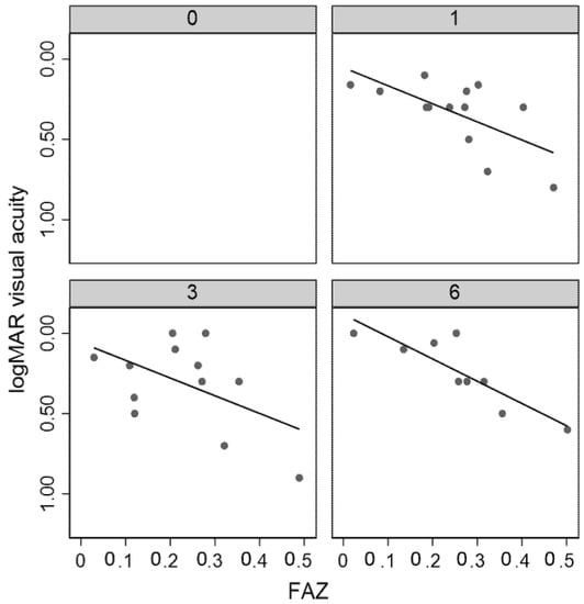 The FAZ area did not significantly change during follow-up. It showed a linear correlation with BCVA at the first and sixth months after surgery—the bigger the FAZ, the lower the visual acuity (p < 0.05). No significant difference was found in mean FAZ between healthy and affected eyes.