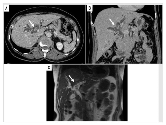Enhanced computed tomography (CT) and magnetic resonance imaging (MRI) of intraductal papillary neoplasm of bile duct (IPNB). (A) Enhanced CT (horizontal section). The intrahepatic bile ducts are dilated with enhanced intraductal mass lesions (IPNB) (→). (B) Enhanced CT (coronal section). Mass lesions (IPNB) (→) are found in the dilated intrahepatic bile ducts. (C) MRI findings (T2 weighted image, coronal section). Bile duct reveals diffuse dilatation with low intensity tumors (IPNB) (→) at the hilar portion.