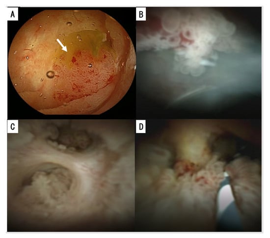 Peroral cholangioscopy (POCS) can visualize the bile duct directly and assess the extent of the tumor [,,,] (Figure 3A,B). POCS can be performed immediately after ERC with endoscopic sphincterotomy (EST) after the sufficient removal of mucin [,]. POCS can approach the bile duct directly and assess the surface and other characteristics of intraductal tumors and the surrounding biliary mucosa []. Characteristic findings of IPNB by cholangioscopy include papillary projections with or without the surrounding fish-egg-like or granular mucosa. In the observation of the fine mucosal structure, narrow-band imaging (NBI) is reportedly as good as or better than light imaging [,,,]. NBI reveals the fine mucosal structure and microvessels of the tumor. POCS allows for tissue and cytology samples to be obtained. Direct cholangioscopy should be considered as an adjunctive therapy to facilitate direct visualization and diagnostic sampling, especially in cases where advancement of the wire deep into the remnant bile duct is not feasible []. Furthermore, direct cholangiography with a biopsy was reported to facilitate determining the extent of type 1 IPNB and performing limited surgical resection [].