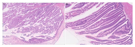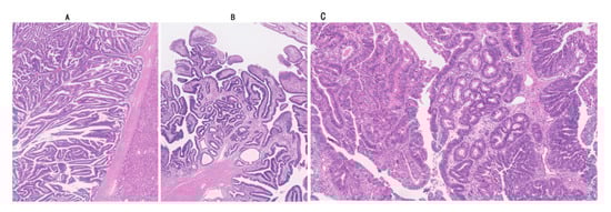 IPNBs are a preinvasive, papillary/villous biliary neoplasm with variable tubular components, covering fine fibrovascular stalks or with fibrous stroma in dilated bile ducts (Figure 5A,B). Some cases of IPNB, particularly oncocytic subtype, show mildly widened stroma due to edema and inflammatory cell infiltration []. The histology of IPNB is heterogeneous, depending on the subtypes, mucin production, grade of cytoarchitectural atypia, invasion and tumor location along the biliary tree [,].