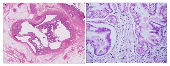 Cystic micropapillary neoplasm of bile duct. (A) The neoplastic lesion around the hilar bile duct shows cystic lesions with micropapillary epithelial growth (arrows). Lower magnification. H&E in the figure legend should be changed to (×50, original magnification, H&E). (B) Cystic micropapillary neoplasm shows pyloric gland changes and foveola appearance suggesting gastric phenotype. H&E in the figure legend should be changed to (×200, original magnification, H&E).