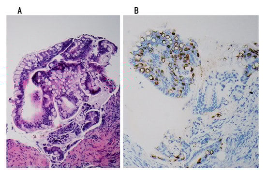 IPNBs are histologically classifiable into four subtypes based on their epithelial cell lineages: intestinal IPNB (iIPNB), gastric IPNB (gIPNB), pancreatobiliary IPNB (pbIPNB) and oncocytic IPNB (oIPNB) [,,,,,,]. This subtyping is facilitated by immunohistochemistry to detect mucus core proteins and cytokeratins []. The main histologic and immunohistochemical features of IPNBs described in previous reports [,,,] are shown in Table 3. The intracellular mucin expression is dependent on the grade of epithelial atypia as well as the subtype. Regarding the incidence, iIPNB and pbIPNB are relatively frequent compared with gIPNB and oIPNB, and the incidence varies among reports and is dependent on geographical differences [,,]. The presence of these four subtypes itself is considered a feature distinguishing IPNB from other biliary tumors and supports the notion that IPNB and IPMN share pathologic and phenotypic features [,,,,].