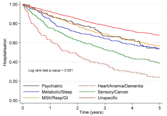On borderline statistical significance, subjects in the sensory/cancer pattern showed a higher hazard of first hospitalisation and a higher number of hospitalisations, compared to those in the unspecific pattern. This is arguably due to cancer, which, in its severe and advanced forms, causes pain, psychological distress, complications of treatment and hospital emergency visits [36,37,38]. This is in line with an Italian study showing a 44% higher risk of hospitalisation among participants in the cancer pattern [23]. Subjects in this pattern could also be frailer, as indicated by their older age and higher prevalence of underweight, a typical feature of the frailty phenotype [39].