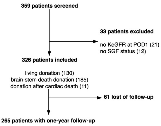 From January 2003 to December 2016, 359 patients older than 18 years old who underwent a kidney allograft in the Geneva University Hospitals were screened. We excluded 21 (6%) patients as KeGFR estimations could not be performed at POD 1. Finally, we excluded 12 (4%) patients as the SGF status could not be assessed due to missing creatinine values. We finally analyzed 326 patients (Figure 1). In this population, the median age was 53 (ranging from 43 to 63) years old with 199 men and 127 women. Patients’ characteristics are shown in Table 1. Living donor kidney transplantation was performed in 130 (40%) patients. Donors included both brain-stem death donor (n = 185, 57%) and donation after cardiac death (n = 11, 3%). Median eGFR at 12 months using CKD-EPI equation was 54 (44–67) mL/min/1.73 m2. SGF occurred in 76 (23%) patients. Comparatively to the kidney recipients who did not experience SGF, patients displaying SGF were older (58 versus 52 years, p = 0.009), received an allograft less frequently from a living donor (16% versus 48%, p < 0.001), which donors were also generally older (57 versus 52 years old, p = 0.017) and needed more frequently dialysis (0.8% versus 6.6%, p = 0.003). In patients with SGF, 3 month, 6 month and one-year estimated GFRs after transplantation were lower (42 (32–63) mL/min/1.73 m2 versus 56 (48–68) mL/min/1.73 m2, 46 (31–60) mL/min/1.73 m2 versus 54 (45–69) mL/min/1.73 m2, 47 (38–60) mL/min/1.73 m2 versus 57 (45–69) mL/min/1.73 m2, respectively, p < 0.005).