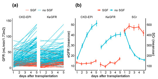 Over the five first days after transplantation and independently of the SGF status, KeGFR slightly increased over time (+2.7 mL/min/1.73 m2/day, p < 0.001). CKD-EPI evolved differently. Although it did not increase in SGF patients (+0.1 mL/min/1.73 m2/day, p = 0.7), patients without SGF displayed a rapid increase in eGFR (+9.2 mL/min/1.73 m2/day, p < 0.001) following the serum creatinine levels (−61 µmol/L/day, p < 0.001 for no SGF patients) (Figure 2a,b).