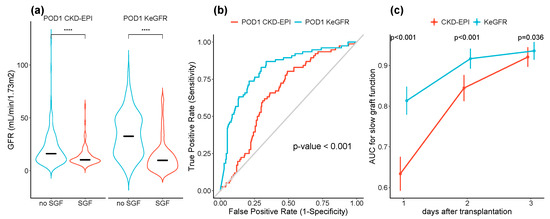 We then considered the 262 patients who had KeGFR and GFR recorded each in the three first postoperative days following transplantation. During the whole period, KeGFR better discriminated the SGF and non-SGF groups than CKD-EPI eGFR. (Figure 3c).