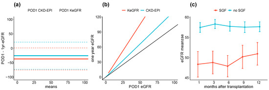 KeGFR and CKD-EPI at POD1 and one-year eGFR. (a) Bland–Altman plot comparing eGFR one year after transplantation calculated using CKD-EPI and postoperative day 1 (POD1) GFR estimated either by KeGFR (blue) or CKD-EPI (red). Plain lines showed limits of agreement and dot lines showed biases, and (b) GFR estimated using CKD-EPI one year after renal transplantation according to POD1 GFR estimated either by KeGFR (blue) or CKD-EPI (red). (c) GFR estimated using CKD-EPI in the first year following renal transplantation, according to slow graft function status.