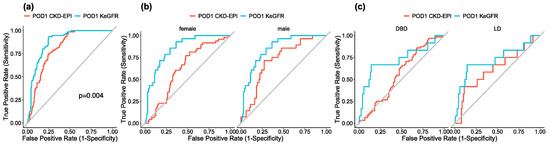 When defining SGF as a serum creatinine level greater than 264 µmol/L by POD 5, we found discrimination ability for predicting this entity to be better with KeGFR than CKD-EPI (AUC = 0.88 95% CI [0.85;0.92] and 0.81 95% CI [0.76;0.86], respectively, p = 0.004) (Figure 5a). At POD 1, the area under the ROC curve for SGF prediction was better for KeGFR compared to CKD-EPI in both male and female patients (AUC 0.80 versus 0.63 for females, p < 0.001 and AUC 0.85 versus 0.72, p < 0.001 for males) (Figure 5b) as well as in donation after brain death (DBD) and living donation (LD), (AUC 0.78 versus 0.56, p < 0.001 for DBD and AUC 0.72 versus 0.62 for LD, p = 0.04, with KeGFR and CKD-EPI respectively) (Figure 5c).