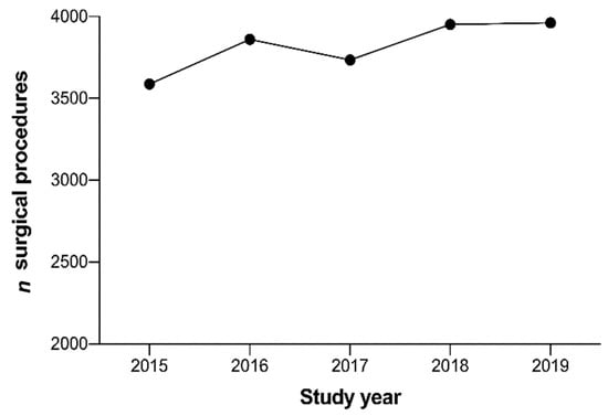 During the study period, a total of 16,349 patients were admitted to our department and underwent surgical procedures (Table 1). The numbers of surgical procedures steadily increased over the study years, from 3587 in 2015 to 3962 in 2019 (an increase of 10.5%) (Figure 1).