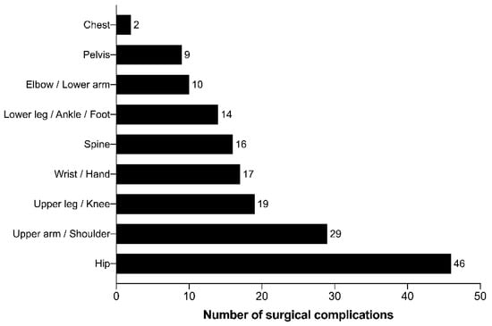 Within the 5-year study period, the overall rate of surgical complications was 0.8% (overall n surgical complications = 161). The distribution of the anatomic region of the registered complications is shown in Figure 2. The anatomic region most often affected was the hip (n = 46; 28.6% of all complications), followed by the upper arm and shoulder (n = 29; 18.0%) and the knee (n = 19; 11.8%).