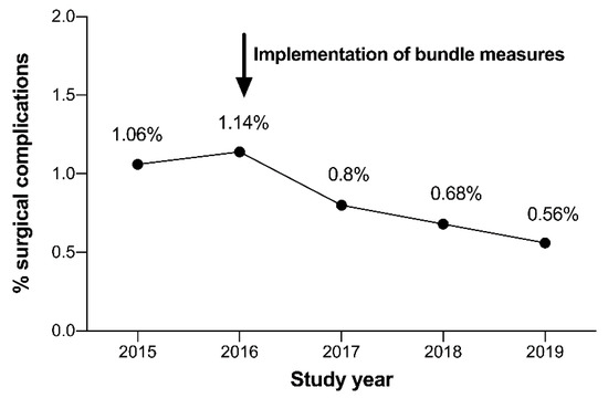 The overall and specific complication rates between the two study periods (2015–2016 (before implementation of the complication avoidance care bundle) vs. 2017–2019 (after implementation of the bundle)) were tested for significance using the Chi-Square or 2-sided Fisher exact test. Statistical significance was set at p < 0.05. All statistical analysis was performed using the Statistical Package for Social Science (SPSS for Mac), version 26.0 (SPSS Inc., Chicago, IL, USA).